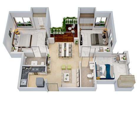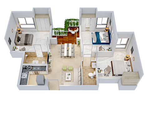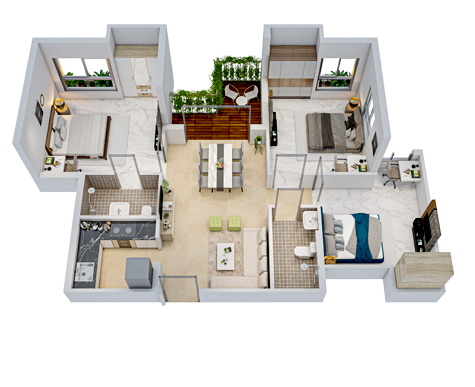 Vitrified/ Ceramic tiles in Bedrooms, Living/ Dining, Anti-skid ceramic tiles in Bathroom/ Open Terrace/ Planter.